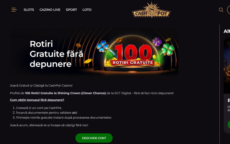 Oferta CashPot bonus fara depunere este una dintre cele mai apreciate deoarece permite testarea platformei fără investiții inițiale. Este posibil să includă rotiri gratuite sau credit promoțional care poate fi folosit în anumite jocuri. Bonusurile fără depunere sunt oferite în campanii speciale sau sporadice și sunt foarte apreciate de jucători.