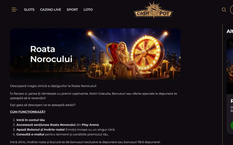 Zona dedicată pacanele CashPot este una dintre cele mai vizitate secțiuni ale platformei, datorită zecilor de sloturi interesante, cu teme diverse și bonusuri generoase. Fiecare joc este conceput pentru a oferi emoție și recompense atractive, de la sloturi clasice cu simboluri tradiționale până la jocuri video moderne cu animații 3D. Jucătorii pot găsi sloturi cu rotiri gratuite, multiplicatori, role extinse, runde bonus interactive și jackpoturi progresive. Interfața fiecărui joc este intuitivă, iar viteza de rulare a fost optimizată pentru o experiență fluidă.